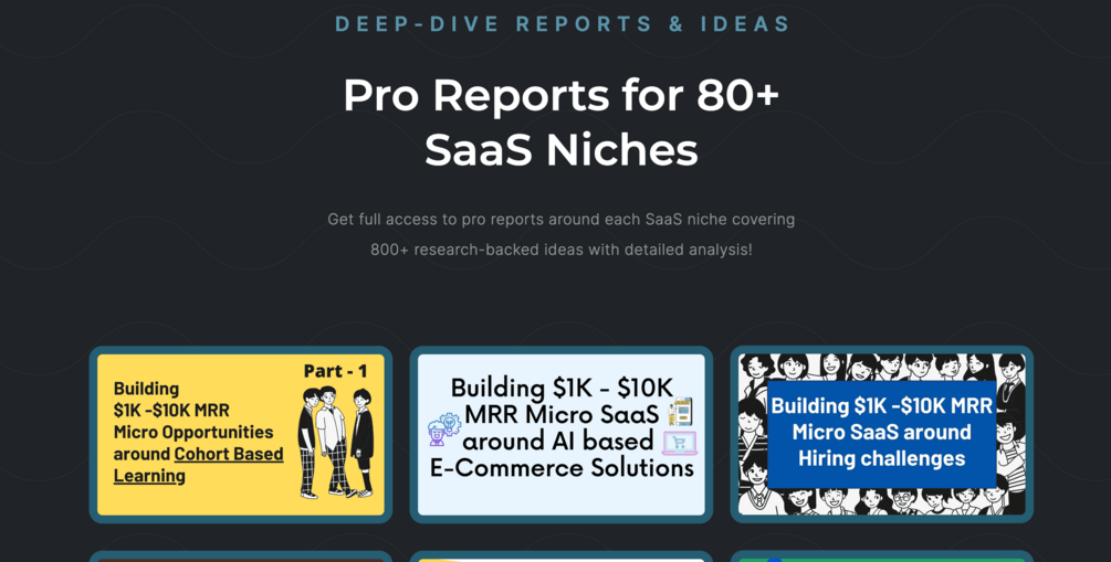 Get Access to 1200+ validated Ideas, marketing courses, data, insights & analysis for 120+ SaaS niches with implementation guides. A supportive community of founders. Research done for you. Start your Micro SaaS journey and iterate faster at building profitable products.